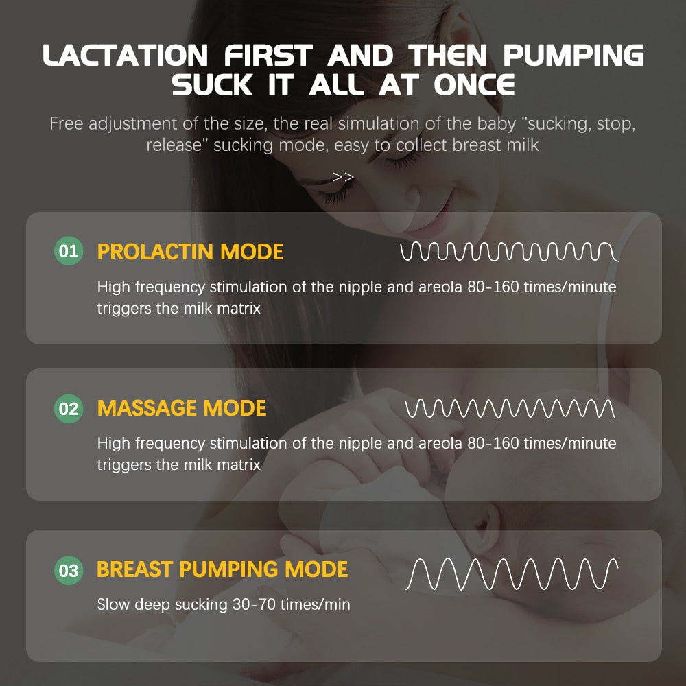 ארבעה מצבים ו-9 רמות שאיבה לבחירה, עיסוי וממריץ את השדיים לפני שאיבה, נוח וללא כאבים. מסך בחדות גבוהה, מציג את מצב העבודה, רמת יניקה, זמן, מצב סוללה וכו' בבירור. לוח מגע רגיש, לחצו על ידי אצבע אחת לתפעול, קל ונוח.